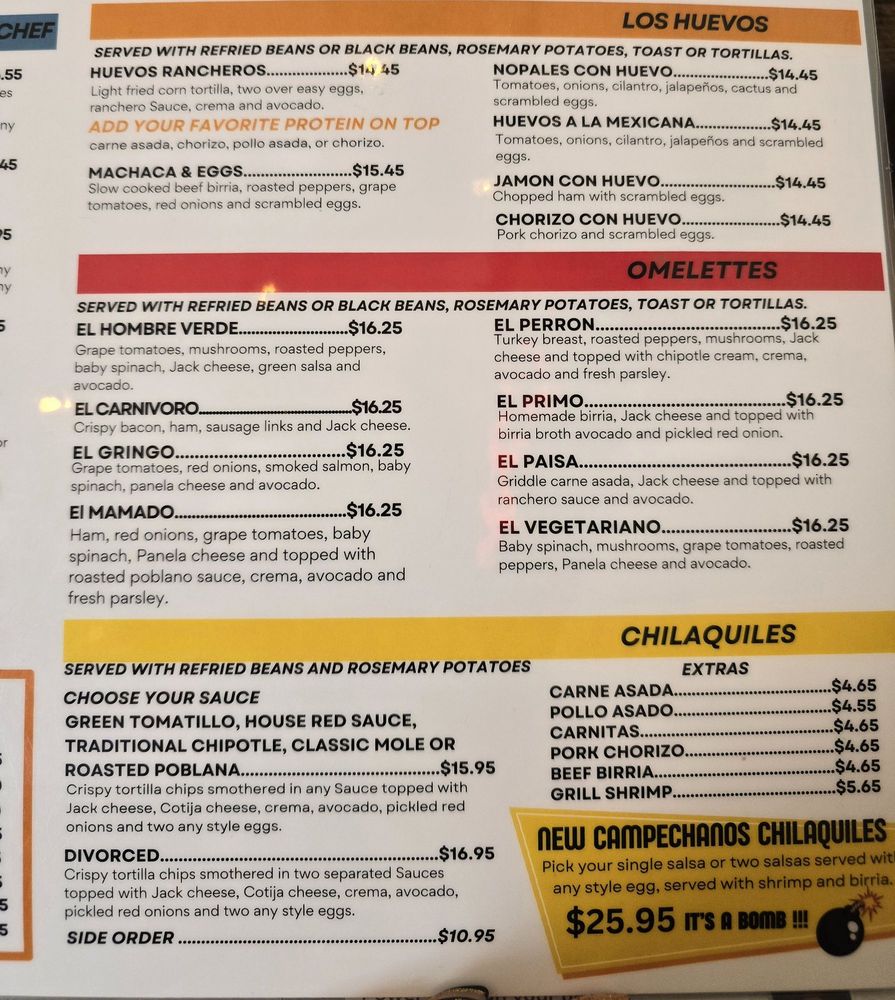Choice any house omelet, 1/2 order of any chilaquiles, country potatoes, refried beans, and toast.