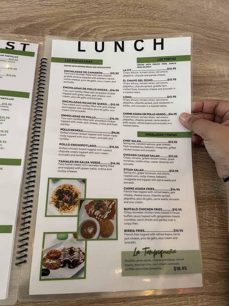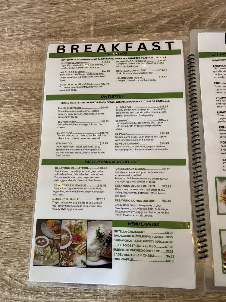 Delicious corn tamal topped with green salsa, 1/2 order of any chilaquiles, 1/2 order of any French toast or any house crepe, 2 any style eggs and refried beans or black beans.